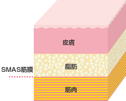 症状が進行すると皮膚表面だけでなく皮下組織(皮下脂肪)や筋肉の弾力低下にまでおよぶことがあります。特に、線維性筋膜(SMAS筋膜)と呼ばれる、より深部の筋膜組織にたるみの本態があるといわれています。最近の外科的手法(フェイスリフト手術)ではSMAS筋膜を引き上げることが重要ポイントとなっており、フェイスリフト手術が成功するか否かはSMAS筋膜へのアプローチ次第です。理想的なたるみ治療は、SMAS筋膜をも含めたリフトアップをはかり、一度の治療でたるみにくいお肌を作ることと言えるでしょう。